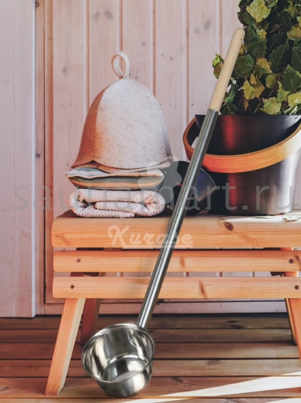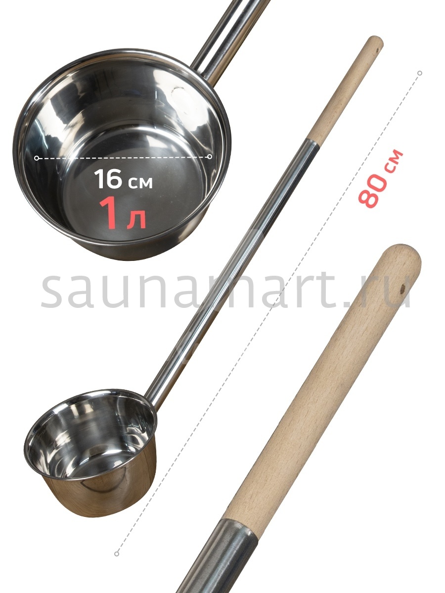 Длина банного инвентаря 80 см, диаметр ковшика 16 см.