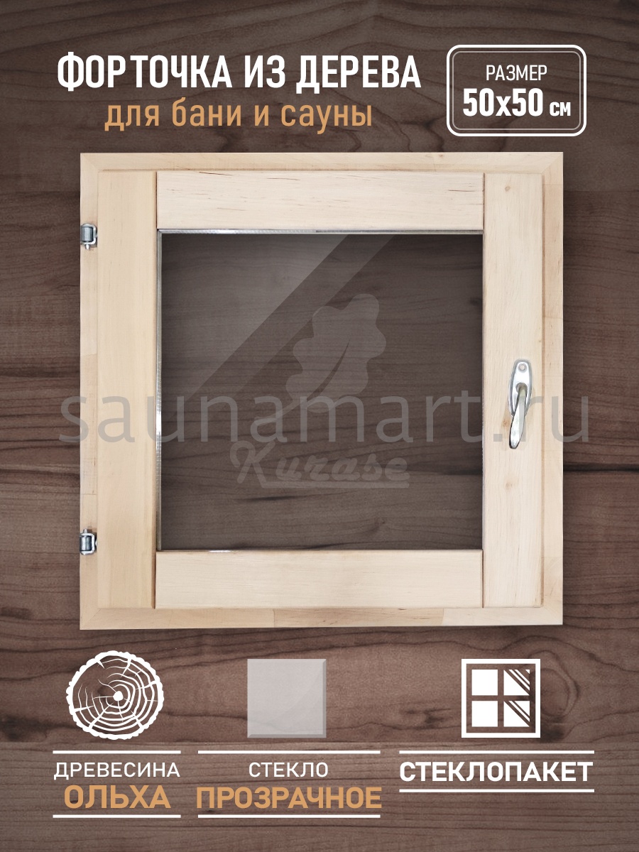Окно для бани из ольхи 50х50 см. Однокамерный стеклопакет. Окошко из прозрачного стекла. Деревянная рама с фурнитурой в комплекте: петли, ручка и затвор. Форточка для бани из клееной древесины: цельные бруски дерева, срощенные между собой. Это позволяет сделать изделие более долговечным прочным, устойчивым к перепадам температуры и влажности. Банное остекление готово к установке нужно только прикрутить ручку. Маленькое окно в парилку снижает теплопотери, обеспечивает проветривание, вентиляцию и поступление дневного света. Деревянное окно необходимый атрибут в русской бане, как дополнение к системе воздухообмена. Одновременное открытие банной двери и окна образует сквозняк, позволяющий обеспечить тщательное проветривание, для сохранности и долговечности внутренней отделки стен, пола, потолка, печи и полок в бане. Оконная рама не выделяет смол, прекрасно переносит условия высокой влажности и температуры, демонстрируя: влагоустойчивость, устойчивость к гниению и образованию грибка. Деревянная форточка может быть использована для строительства и ремонта гаража, дачного туалета и душевой, дачного домика. Это полезный и нужный подарок для родителей, мамы, папы, бабушки, дедушки, друзей на день рождения, новый год, рождество, 23 февраля и 8 марта.