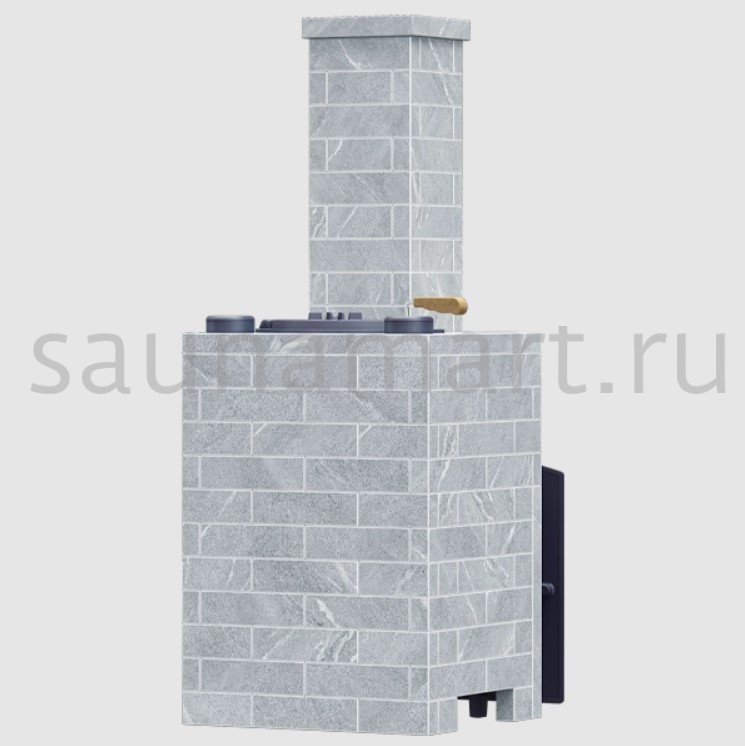 Форма куба и отсутствие отдельных опор на нижнем ярусе обеспечивает устойчивость на подиуме, а прочные крепления из алюминиевого сплава исключают расхождение плит. Перекрытие облицовки выполнено из 2-х плит так, чтобы отверстие под выход дымохода находилось между плитами и давало возможность проводить монтаж с уже установленным дымоходом без дополнительного демонтажа. Расположенные по краям облицовки заливные горловины для поддачи воды декорированы каменными хомутами, которые могут быть выполнены в цилиндрической или восьмигранной форме по Вашему выбору.