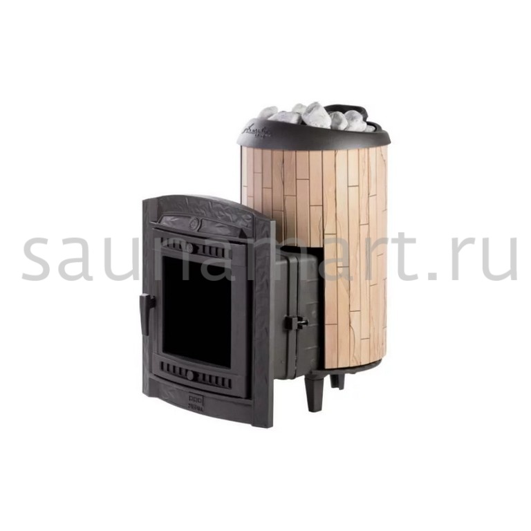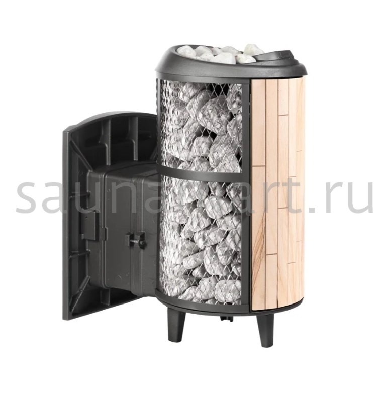 Модель с комбинированной облицовкой из нержавеющей сетки и ламелей. Особенность модели - открывающаяся дверь с ламелями. Это оригинальное решение обеспечивает быстрый прогрев парной.