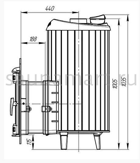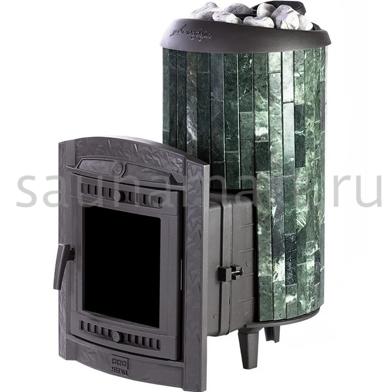 Модель с увеличенной каменкой и повышенной производительностью. Ламели из змеевика, расположенные по периметру внешней каменки, не только обладают отличными теплонакопительными свойствами, но и придают печи уникальный внешний вид.