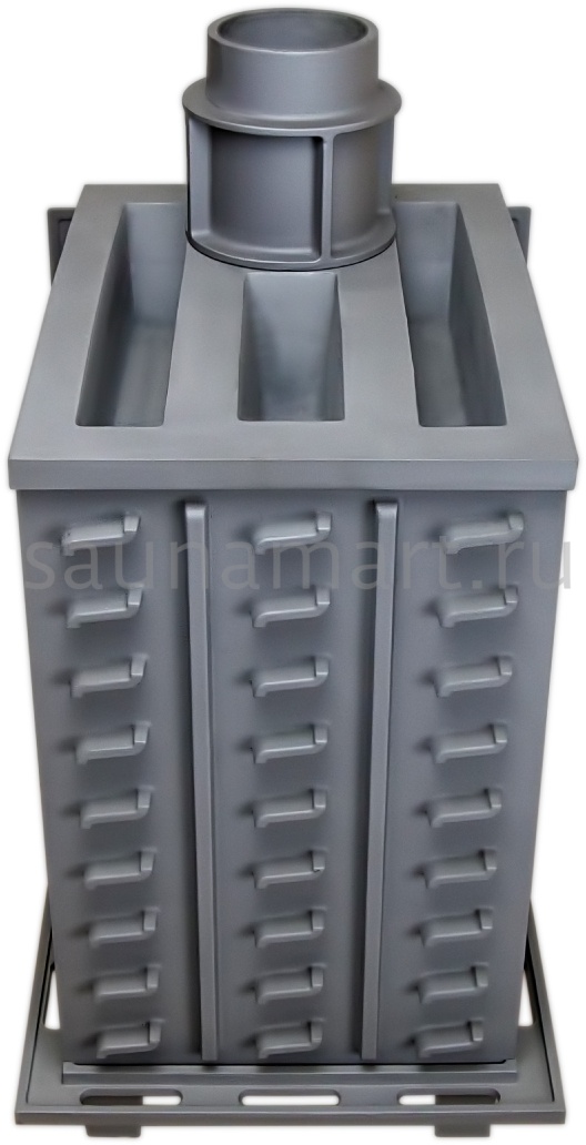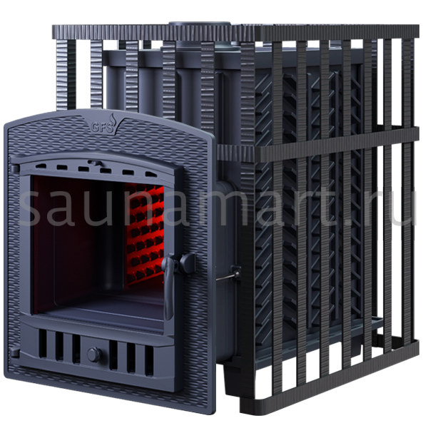 GFS-ЗК 25 — это печь с усиленной каменкой большей массы, с единым углублением внутрь топки для дополнительной укладки чугунного заряда. Теплосъемные шипы, со стороны горения пламени, в разы увеличивают площадь соприкосновения огня с каменкой и ускоряют передачу тепла, а также способствуют лучшему дожигу, смешивая потоки пламени и воздуха, поступающего из воздушника. Эти усовершенствования значительно повышают мощность парообразования печи и выдают большее количество пара при непрерывной подаче воды. Каменка печей GFS-ЗК является незаливаемой.