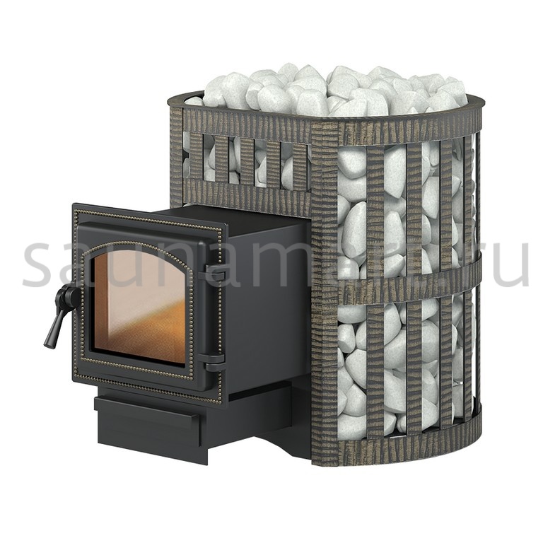 Банная чугунная печь Легенда Ковка 12 (260) укомплектована чугунной герметичной дверцей Везувий 260 с жаропрочным стеклом «SCHOTT ROBAX». Конвекционно-вентилируемый кожух "Ковка" изготовлен из металлической текстурированной полосы, покрашенной термостойкой краской и покрытой патиной «Бронза».
