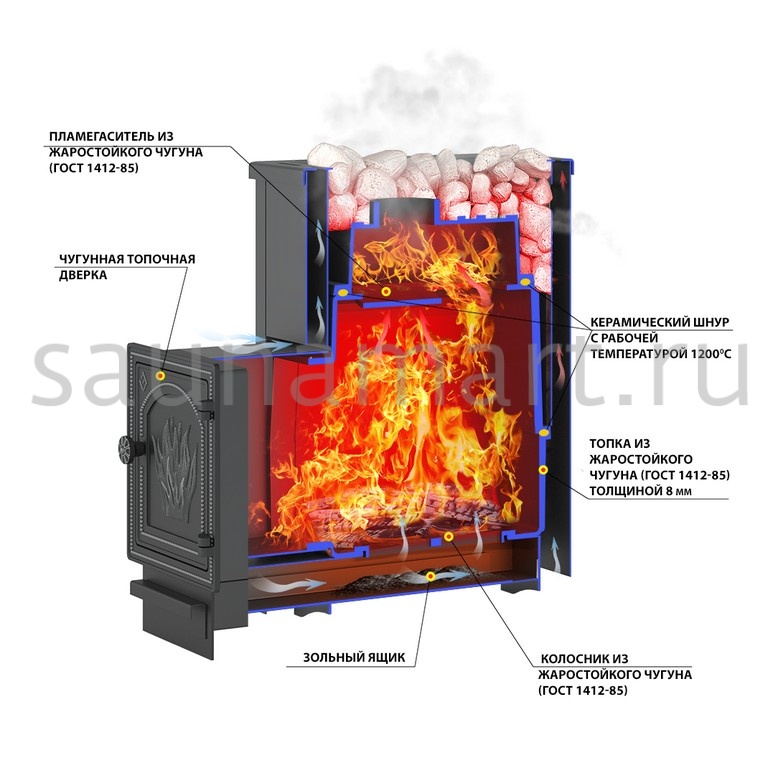Конвекционный кожух обеспечивает активное движение воздуха и прогрев расчётного объёма парилки за минимальное время. Закладом камней в кожух организуют открытую каменку для получения плотного пара.