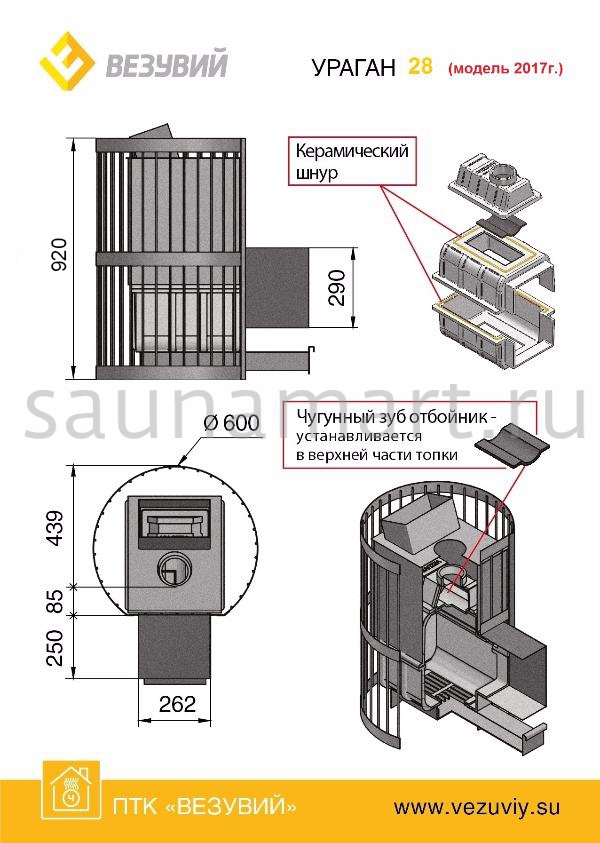 Преимущество печи серии УРАГАН в том, что она состоит из 3-х элементов. На стыке между ними используется керамический шнур с рабочей температурой 1200 градусов, что делает топку печи абсолютно герметичной. Для фиксации деталей между собой применяется болтовое соединение, что даёт 100% гарантию безопасности при эксплуатации. Банная чугунная печь Ураган Стандарт 28 (ДТ-4) укомплектована чугунной негерметичной дверцей Везувий ДТ-4. Закрытая каменка изготовлена из стали и вмещает в себя не менее 60 кг камней. Конвекционно-вентилируемый кожух "Стандарт" изготовлен из металлического прутка диаметром 6 мм, покрашенного черной термостойкой краской.