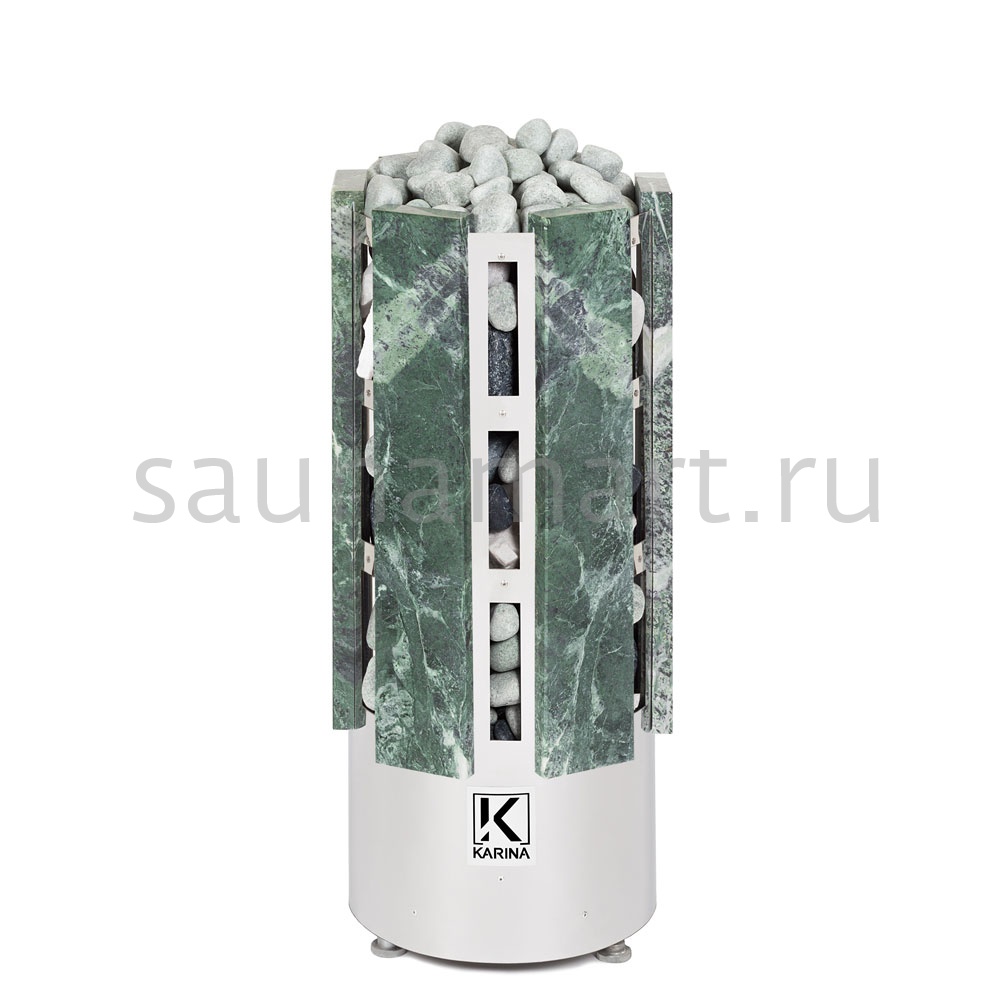 Электрокаменка Karina Forta 6 Змеевик предназначена для использования в парных объемом до 8м3. Печь выполнена в напольном варианте и обладает цилиндрической формой дополненной плитами из натурального камня Змеевика. Напряжение питания - 220/380В. Данная модель имеет 3 тэна, расположенных в виде треугольника. В центре внизу расположен бак для воды емкостью 3 л, который является парогенератором. Выше парогенератора имеется емкость под мелкие камни или нержавеющие шары объемом 2.5 л, вмещающая 5 кг мелкого камня, называемая закрытой каменкой с воронкой для подачи воды и получения мелкодисперсного пара. Электрическая печь Karina Forta 6 Змеевик многофункциональна, и при правильной эксплуатации она подойдет для любителей как финской сауны, так и русской бани.