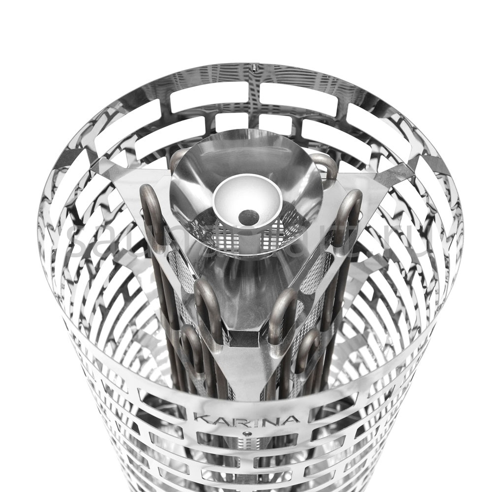 Электрокаменка Karina Nova 6 предназначена для использования в парных объемом до 8 м3. Печь выполнена в напольном варианте цилиндрической формы со встроенным на корпусе регулятором температуры. Напряжение питания печи – 220/380В. Печь укомплектована 3 ТЭНами, расположенными в виде треугольника. Внизу печи - бак для воды емкостью 3 л, который является парогенератором. Выше парогенератора расположена емкость под мелкие камни или нержавеющие шары объемом 2.5 л, вмещающая 5 кг мелкого камня, называемая закрытой каменкой с воронкой для подачи воды и получения мелкодисперсного пара. Электрическая печь Karina Nova 6 многофункциональна, и при правильной эксплуатации она подойдет для любителей как финской сауны, так и русской бани.