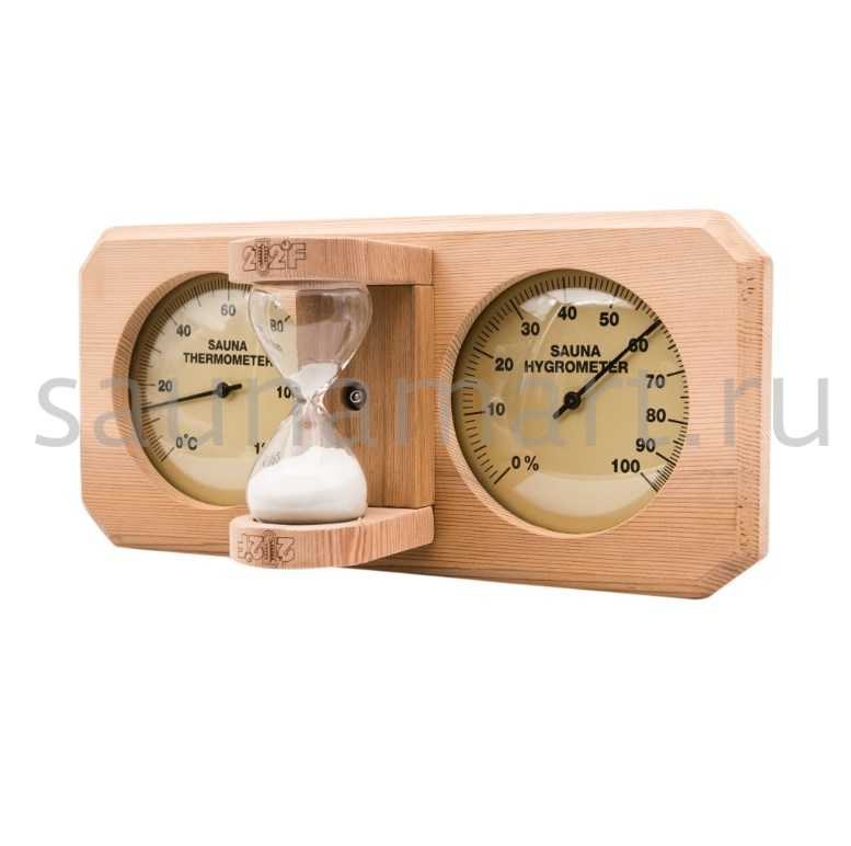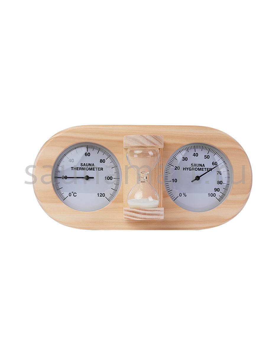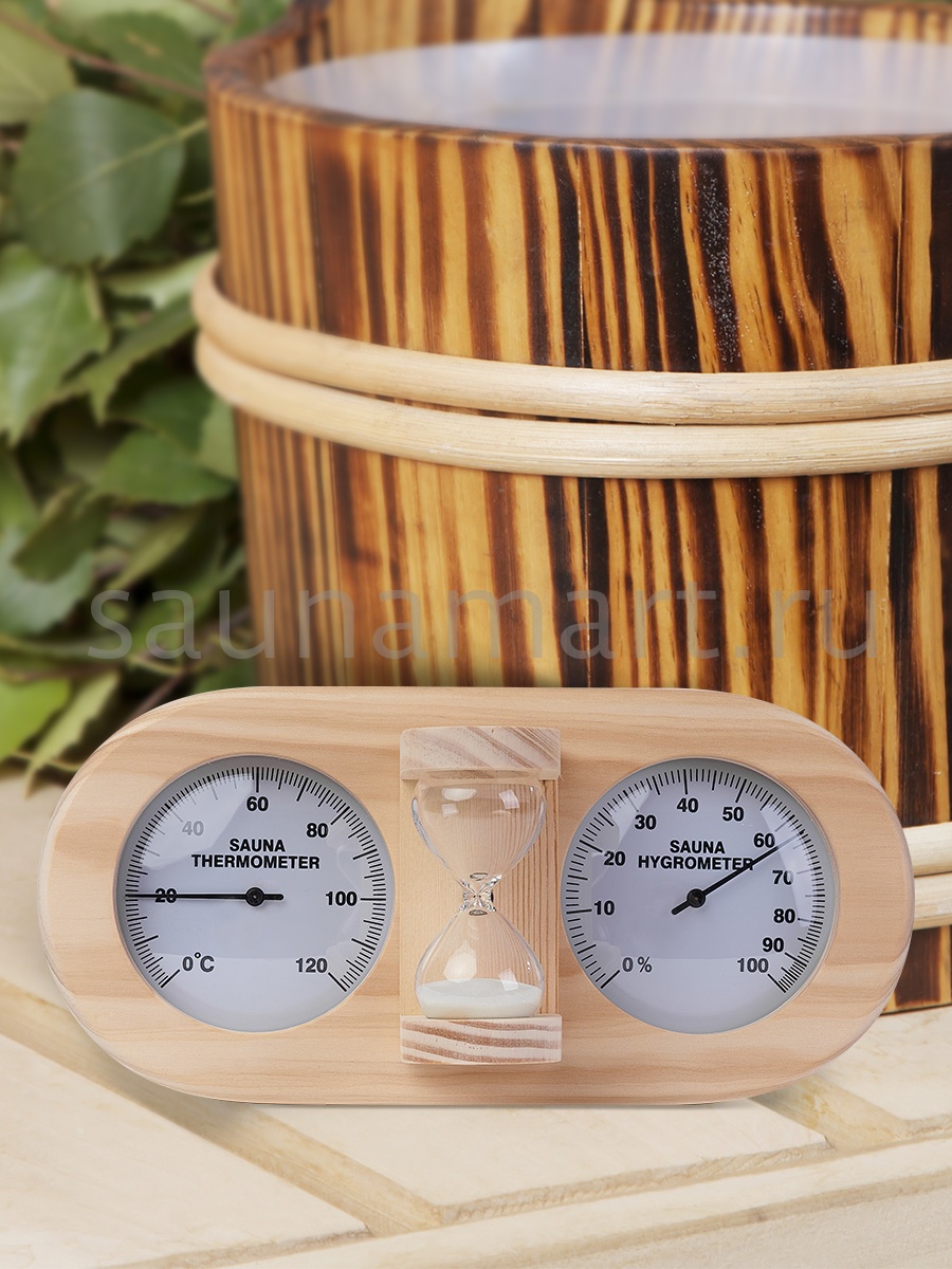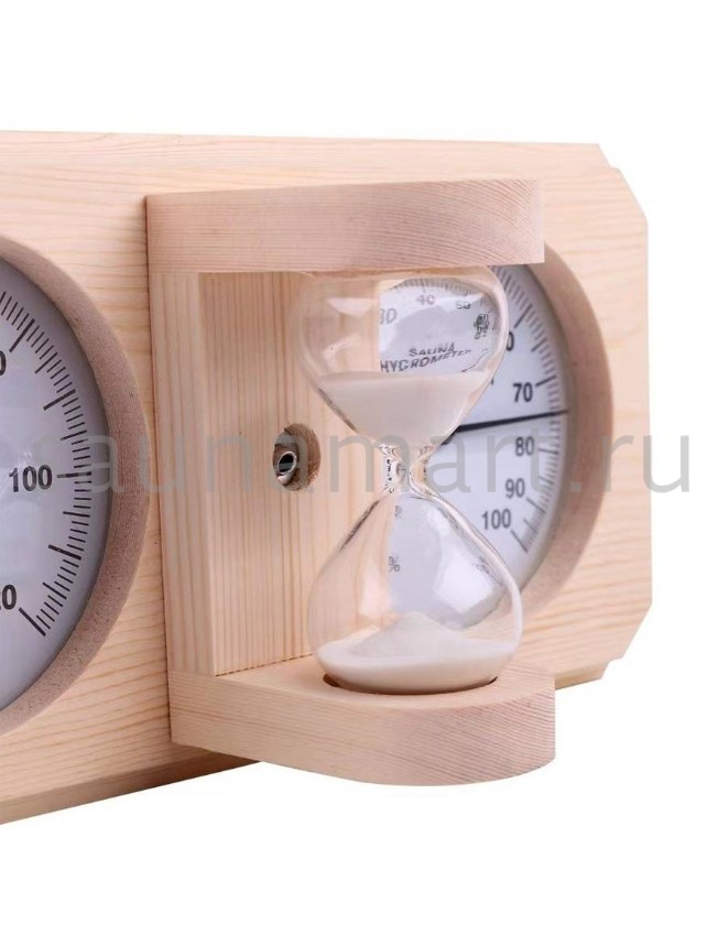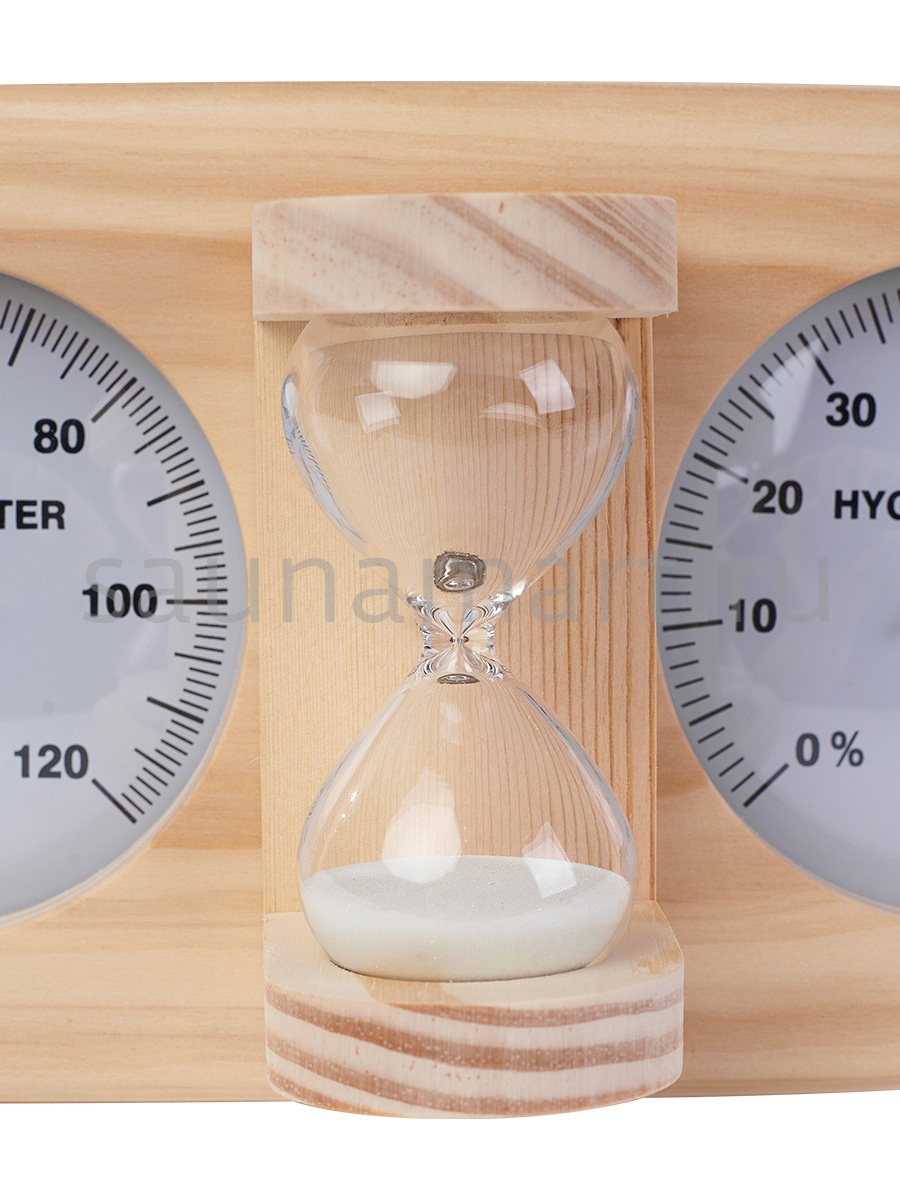 Термогигрометр со встроенными песочными часами 3 в 1 это товары для бани и сауны,  - универсальные аксессуары для обустройства бани, которые создают уют, комфорт, удобство и особенную атмосферу в парилке русской бани. В широкой раме из дерева находятся два круглых циферблата под термостойким стеклом: термометр и гигрометр. Градуировка шкалы гигрометра варьируется в пределах от 0 до 100 %. Градуировка шкалы термометра варьируется в пределах от 0 до 120 градусов по Цельсию. Предусмотрена возможность калибровки измерительного прибора. Между циферблатами располагаются песочные часы для бани, рассчитанные на 15 минут. Это идеальное время нахождения в парилке. Банный аксессуар не боится высокой влажности и температуры, поэтому идеально подходит для использования в любом парильном помещении, как в условиях русской бани, финской сауны так и хамама. Предназначен для настенного размещения. Помните, чтобы проведённое в парной время оказало благоприятный эффект на здоровье и самочувствие, необходимо тщательно соблюдать температурный режим парения, режим влажности и длительности пребывания в парной. Не подвергайте прибор ударам и падению. Упаковано в картонную коробку. Все банные принадлежности нужно выбирать тщательным образом. Представленный банный аксессуар изготовлен из экологичного сырья и прошел все этапы сушки и обработки. Банная метеостанция станет прекрасным подарком для банщиков, отца, мамы, дедушки, мужа, сына, внука, друга, брата, которые любят русскую баню. Эта стильное интерьерное решение подойдет еще и для ванной комнаты и балкона.