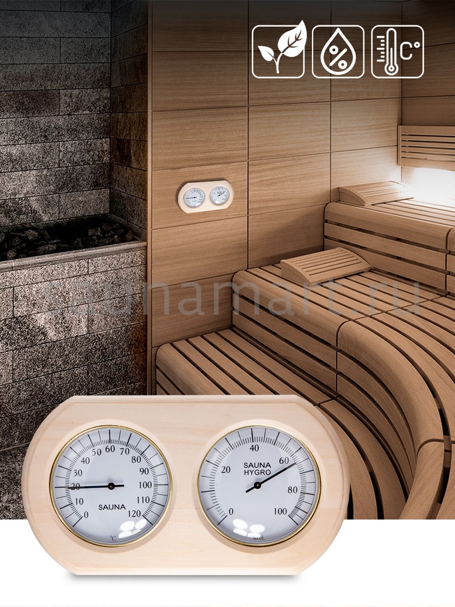 Термогигрометр это комбинированный прибор для измерения температуры и влажности в парной. В лаконичной, овальной, широкой рамке из термо древесины липы находятся два больших, круглых циферблата. Один циферблат - это гигрометр, который с точностью измерит уровень влажности в парной, другой циферблат - термометр, который сообщит о температуре воздуха. Данный прибор прекрасно подойдёт для использования в парной. Благодаря универсальному дизайну он станет прекрасным дополнением любого интерьера. Наш термогигрометр для бани и сауны соответствует всем требованиям для данных приборов - оснащен не сильно нагревающимся корпусом и способен выдерживать перепады температуры и влажности. Размер термогигрометра 24,7х13,6х3,4 см.
