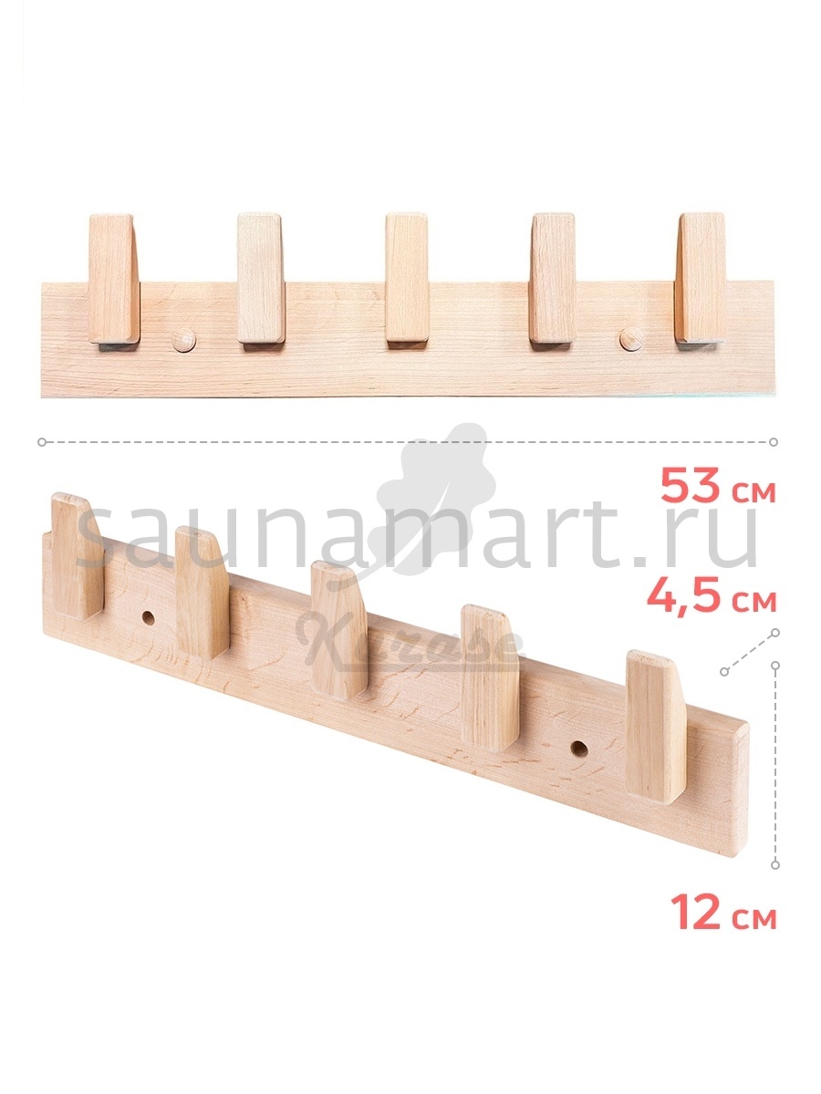 Эко-дизайн, стиль и качество исполнения данного аксессуара не оставят равнодушными ни одного ценителя изделий из древесины. Вешалка выполнена из ценных, благородных пород Кавказского дуба премиального качества и пропитана маслом. Данный аксессуар является универсальным, поскольку может использоваться как в комнате отдыха для хранения халатов, полотенец, шапочек, так и непосредственно в парной, где Вы сможете разместить на нем черпаки, веники, мочалки. Вешалка может использоваться для стилизации ванной комнаты в квартире. Эксклюзивный дизайн данной вешалки Вы можете поддержать другим аксессуаром-компаньоном – полкой для полотенец артикул. 19574. Вешалка имеет 5 крючков и предназначена для крепления на стену. Все элементы крепления закрываются заглушками из дерева. Размер изделия: длина 51 см, высота 12,5 см, толщина 4,5 см.