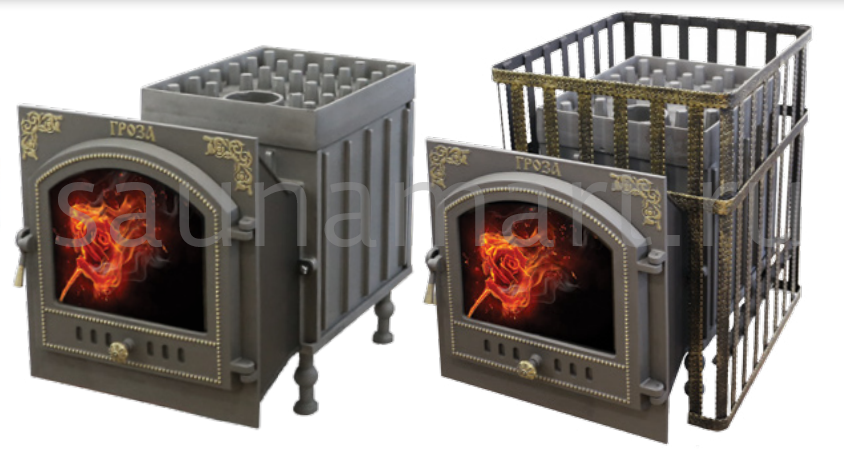 Печь для бани Гроза разработана как максимально экономичная модель для частного применения. Основной принцип работы печи сохранён – получение пара с теплоёмкой каменки прямого нагрева. Каменка является сводом топки, нагревается с нижней поверхности, снабженной теплосъемными шипами для увеличения контакта с пламенем.