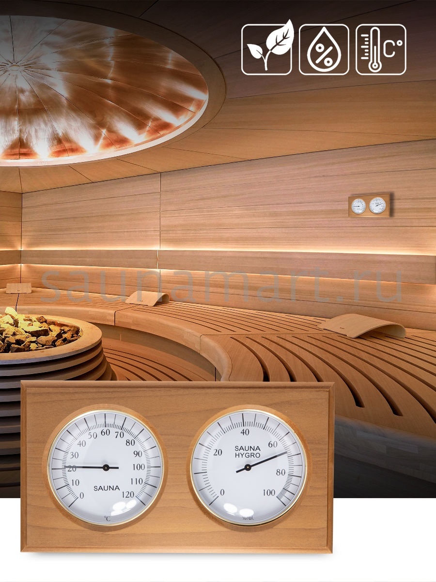 Термогигрометр это комбинированный прибор для измерения температуры и влажности в парной. В лаконичной, прямоугольной, широкой рамке из термо древесины липы находятся два больших, круглых циферблата. Один циферблат - это гигрометр, который с точностью измерит уровень влажности в парной, другой циферблат - термометр, который сообщит о температуре воздуха. Данный прибор прекрасно подойдёт для использования в парной. Благодаря универсальному дизайну он станет прекрасным дополнением любого интерьера. Наш термогигрометр для бани и сауны соответствует всем требованиям для данных приборов - оснащен не сильно нагревающимся корпусом и способен выдерживать перепады температуры и влажности. Размер термогигрометра 24,7х13,6х3,4 см.